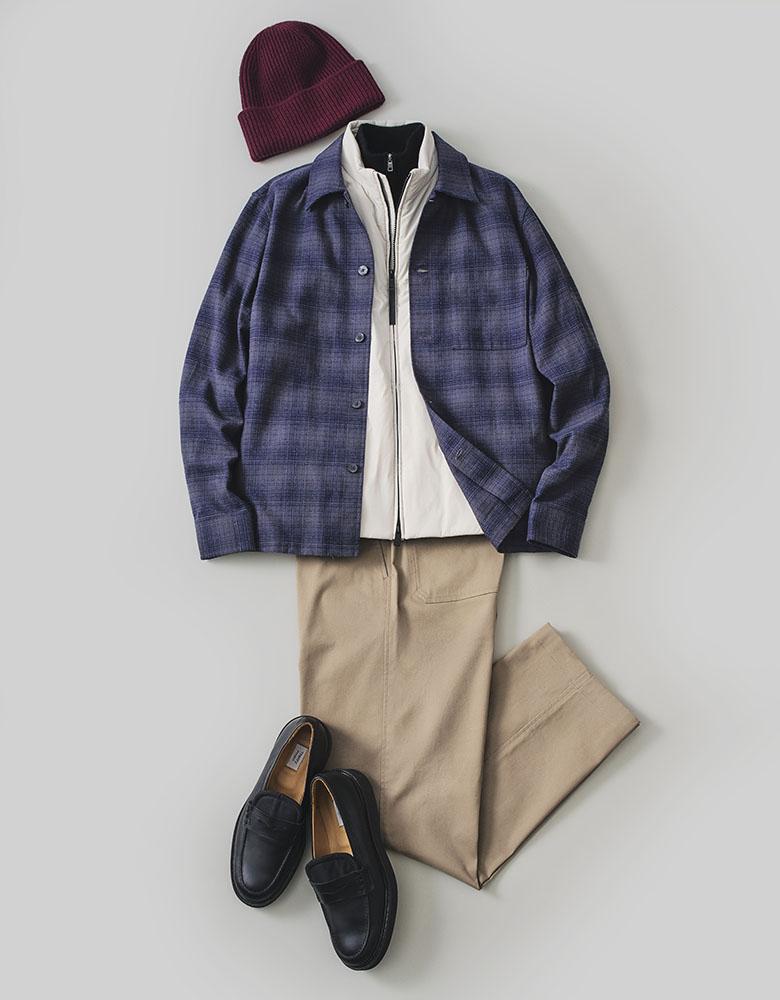 シックな色合いのチェックシャツとチノパンで