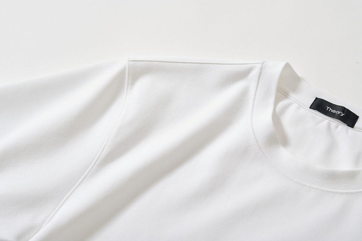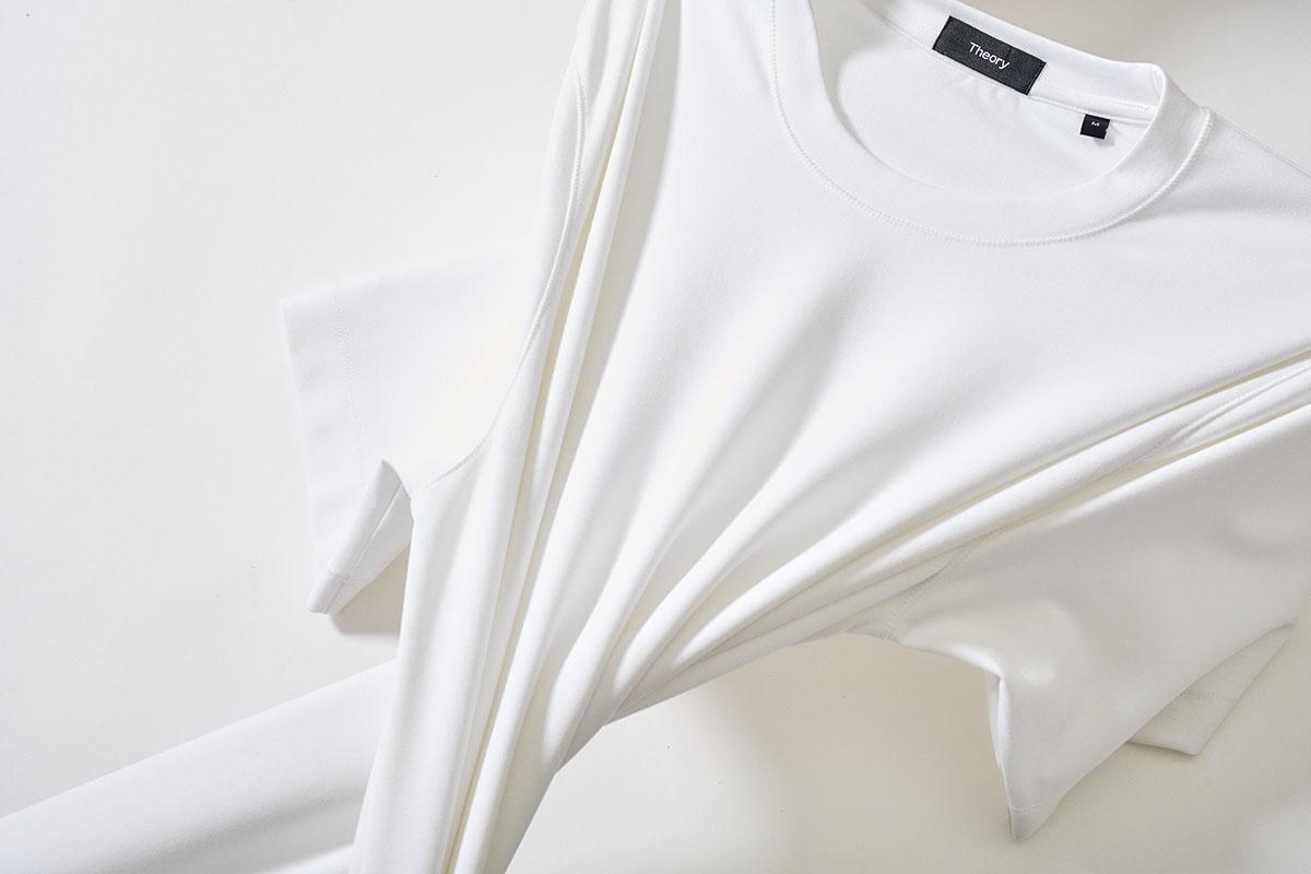 上質な光沢感と美しい発色が生み出す、クリーンな表情。白でも透けにくい絶妙な生地感に、決して肌着に見えないハリ感を備える。シンプルだからこそ、ベーシックの完成度に徹底してこだわった。