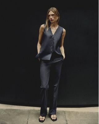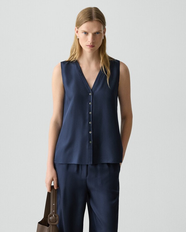 ・深めのネックラインがすっきりとした印象のスリーブレスブラウス。