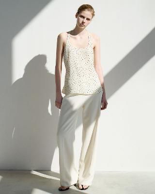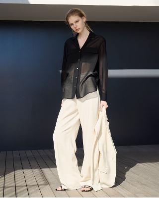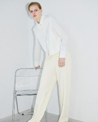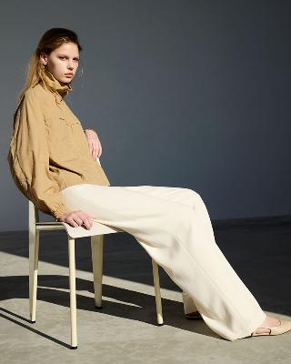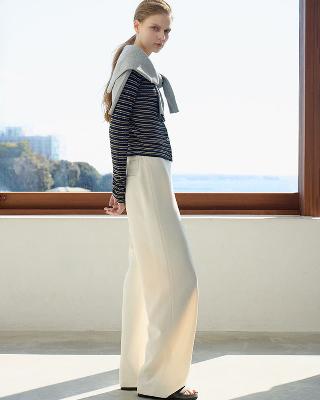 ・前はフラット、後ろのみゴム入りのワイドイージーパンツ。ゆったりとしたレッグラインは、肌にまとわりつかず美しいドレープ感があります。