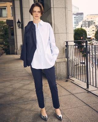 ・横ストレッチ素材で快適な着心地と細見え効果を両立し、オンオフ問わず活躍するタイムレスなデザイン。