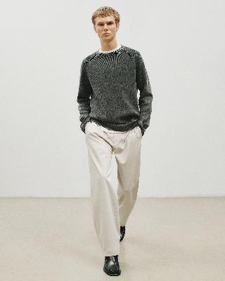 ・表面感のあるウォッシュ加工を施した長袖プルオーバーニット。