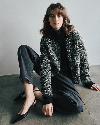 ・ゴールドのラメ糸とモノトーンの編地感をミックスしたツイードニットジャケット。