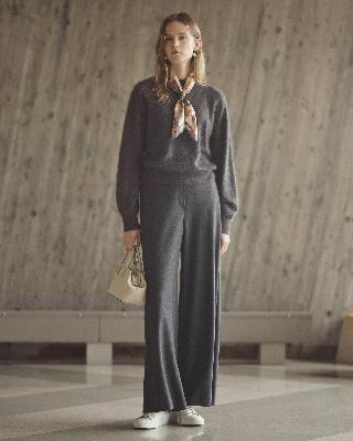 ・大胆なワイドフレアが特徴のイージーパンツ。
