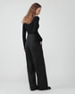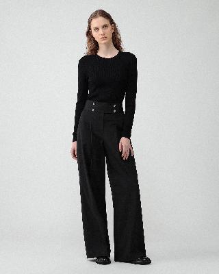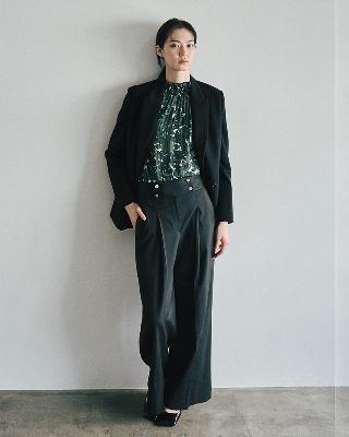 ・太めのベルトでタキシード風のデザインが特徴のワイドパンツ。