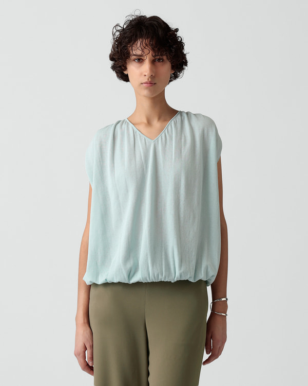 ・ギャザーによるバルーンシルエットが特徴のセーター。