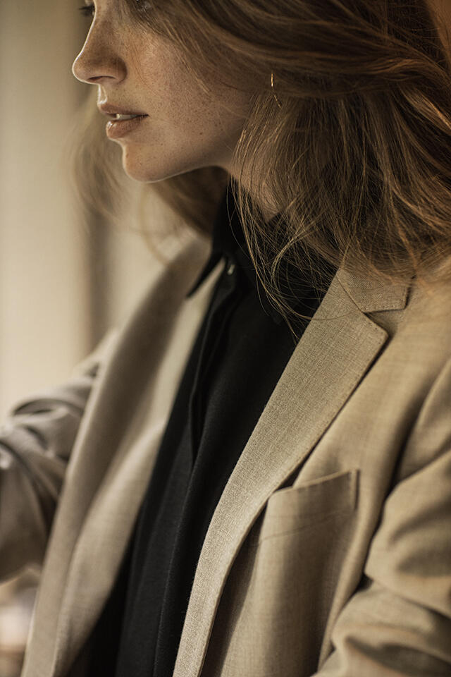 しなやかで暖かみのあるウール素材のノーカラージャケット。一切の装飾を削ぎ落としたクリーンなデザインに加え、ウエスト部分が程よくシェイプされた女性らしいシルエットが美しい。インナーには、適度なフィット感のリブニットを合わせてすっきりと。ジャケットと同素材で色違いの上品なミディ丈スカートは、アシンメトリーなヘムラインがポイント。動きをプラスして、エッジの効いたスタイリングへと導いて。