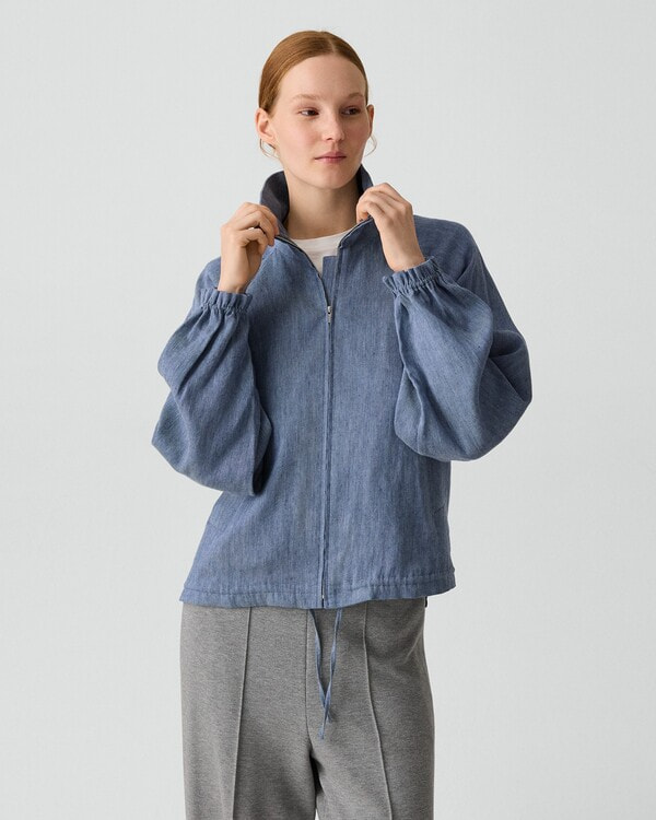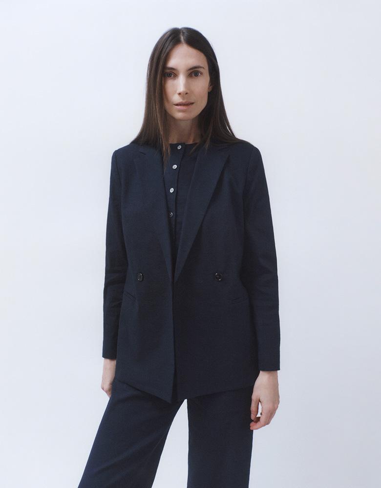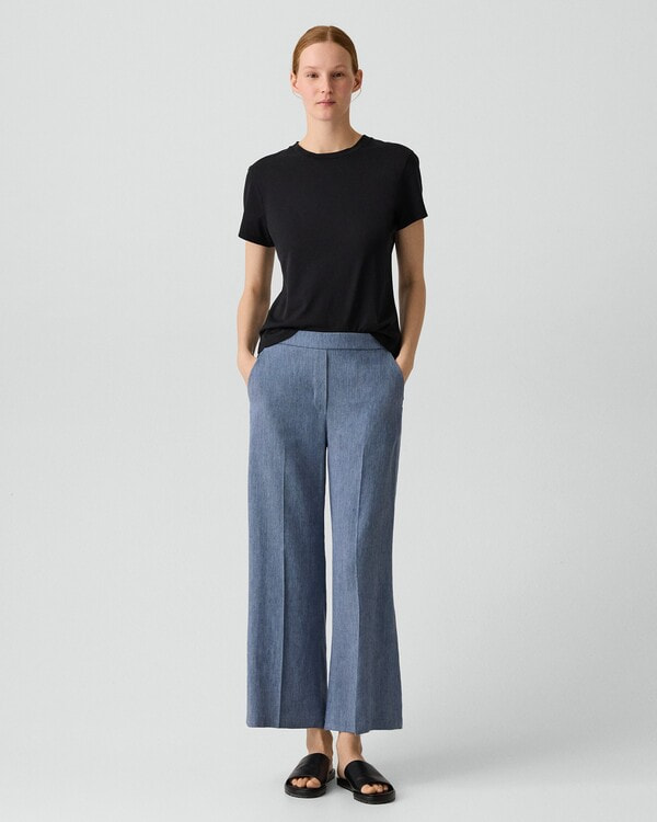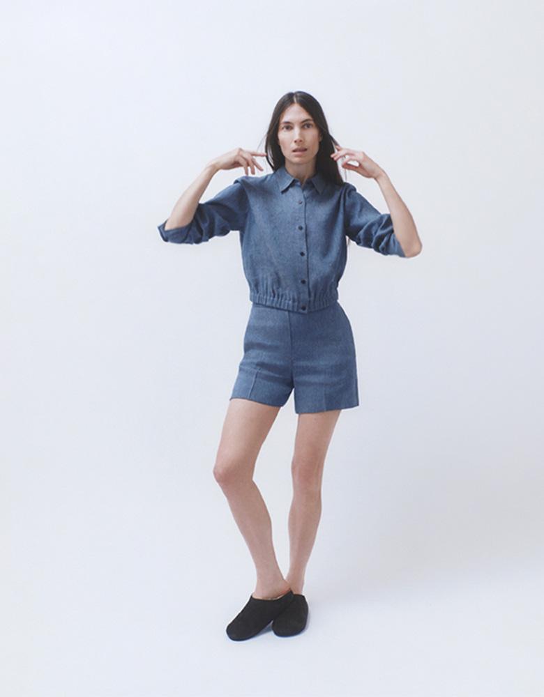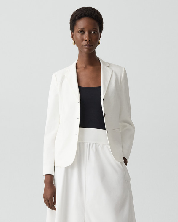 イタリアのプラートにあるマリーニ・アンド・チェッコーニ社で、25年間にわたりTheoryのために織り上げられてきた「Good Linen」は、3種類の繊維(フランス産の麻、廃綿を原料とするレーヨン、部分的にリサイクルされたポリウレタン)から作られています。優れた伸縮性を持ち、風通しが良く軽いこの生地は、ジャケットやパンツ、ドレスやトップスなど、幅広いアイテムに使用されます。