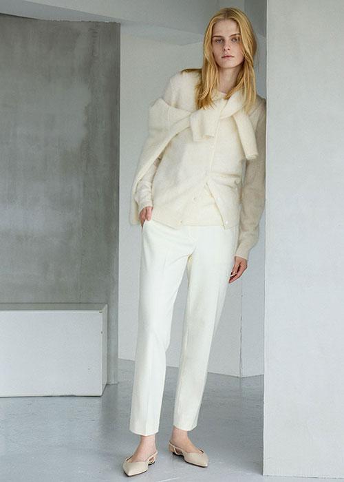 上質なフランネル素材で、別格の保温性と柔らかさが魅力。センタープリーツ、ハイライズ、フルレングスの相乗効果で脚長見えに。パンツの存在感を活かし、トップスはシンプルにまとめるのが正解。