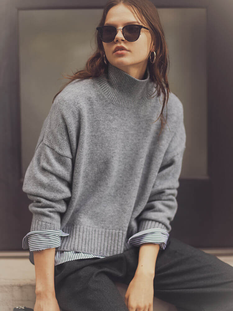 ミッドライズのパンツには、ショート丈のタートルネックニットを合わせて今年らしく。上下ともに無駄のないクリーンなシルエットなので、すっきりスタイリッシュに決まる。