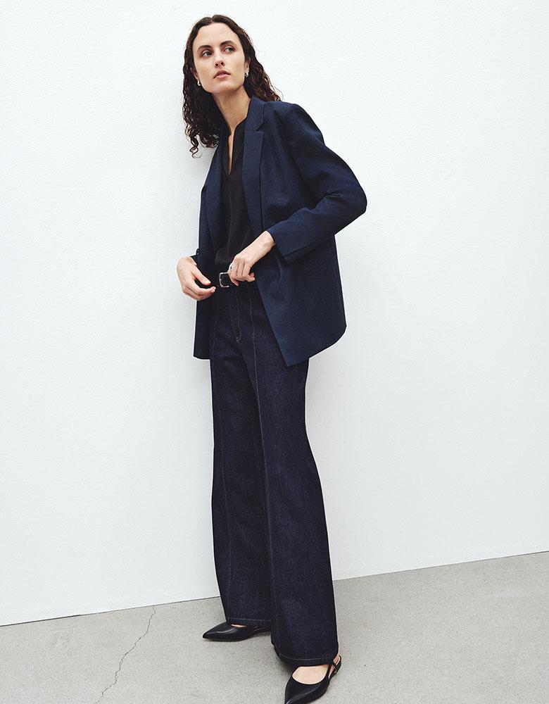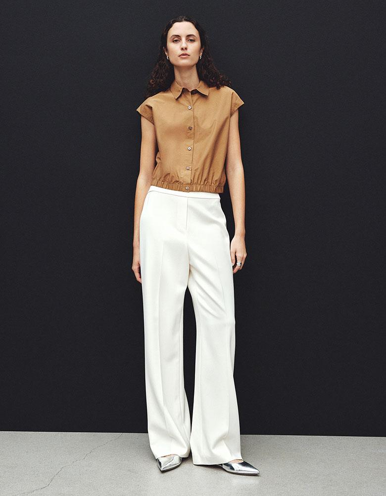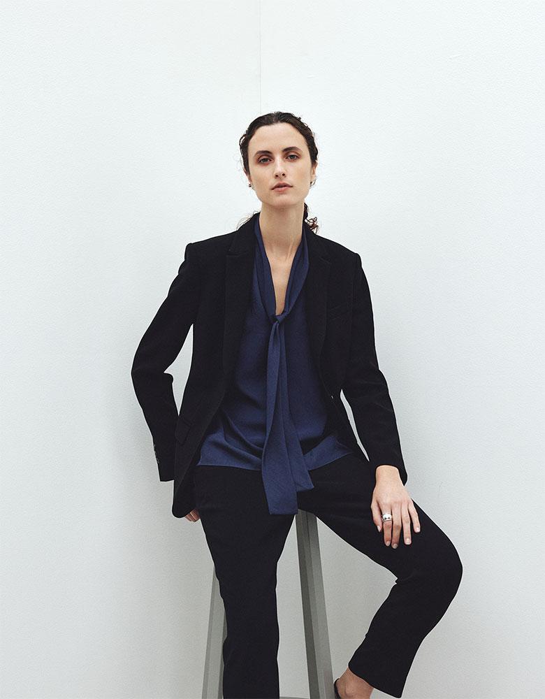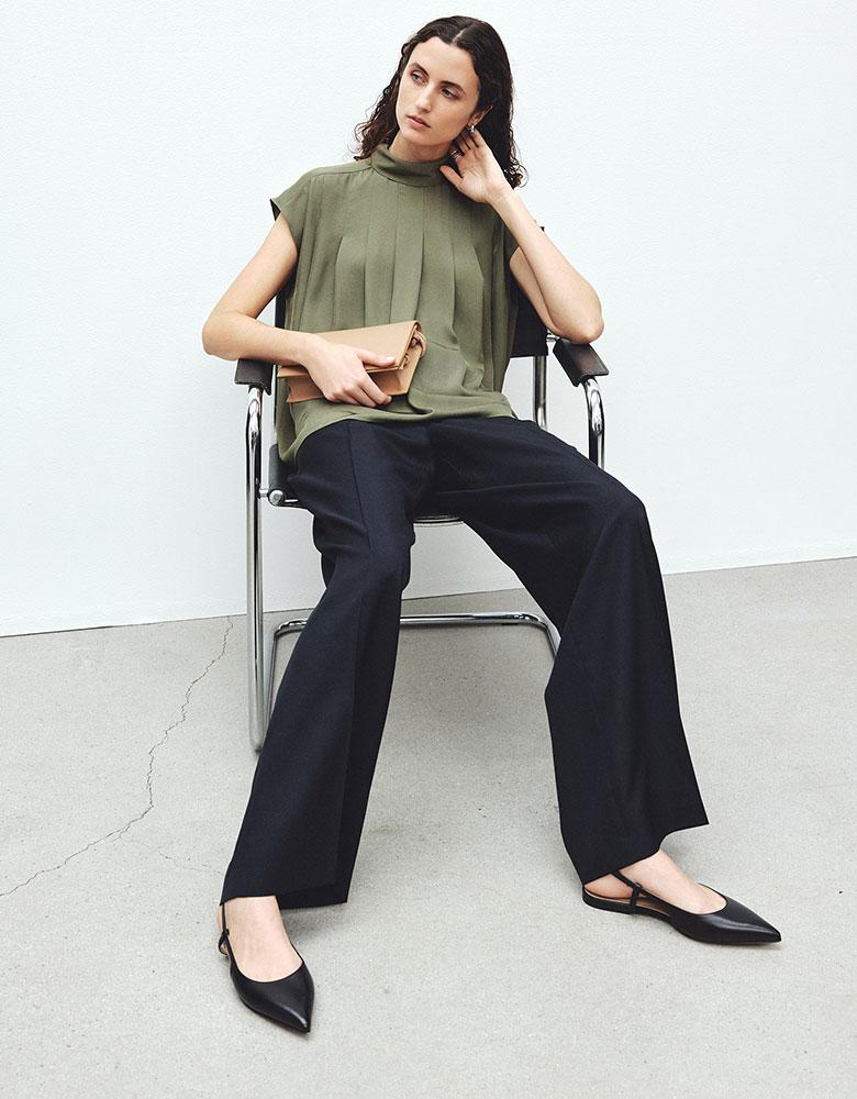 一枚で映えるブラウス×マニッシュなパンツで、仕事からディナーまで