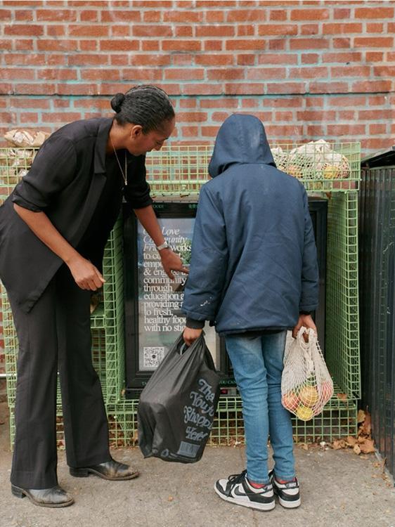 仕事の合間のわずかな静けさのなか、アスメレット・ベルヘ=ルマックスはブルックリン、ベッドスタイのグリーン・アベニューを歩く。この並木通りには、彼女が2020年に設立した非営利団体〈ワン・ラブ・コミュニティ・フリッジ〉の本部がある。地域の食料不安に向き合うため、コミュニティや地元農家、レストランからの寄付で満たされた冷蔵庫を市内各所に設置する—それがこの団体の活動だ。