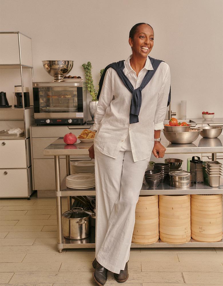 彼女の私生活もまた、日々の暮らしの輪郭に沿って形づくられている。スタイルや愛用するブランドについても、その姿勢は一貫している。「気に入ったものが見つかったら、くたくたになるまで着るか、同じものを2つ買うんです」。17年前に手に入れたTheoryのシガレットパンツは、その象徴だ。「ずっと大切に取っておいて、擦り切れるまで穿きました」。一度しっくりくると感じたものに、迷いなく身を委ねる—それが彼女の流儀だ。