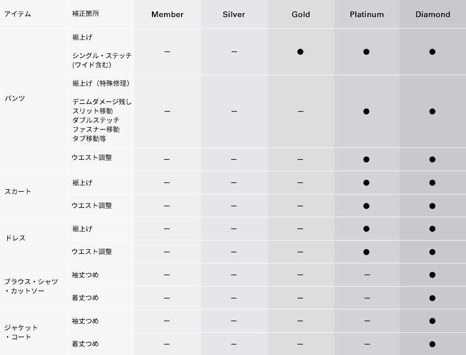 - パンツ裾上げサービスは会員ステータスに応じたサービスで、Gold会員の方はワイドパンツを含むパンツの裾上げが無料(※)、Platinum会員以上の方はさらに多くの補正サービスが無料となります。その他の特典として、全会員対象のアプリ会員先行セールやGold会員以上が対象のVIPセール、そしてPlatinum会員以上の方には、毎年12月のホリデーシーズンにスペシャルギフトや限定イベントへご招待いたします。 (※)裾上げの詳細はこちらをご覧ください。