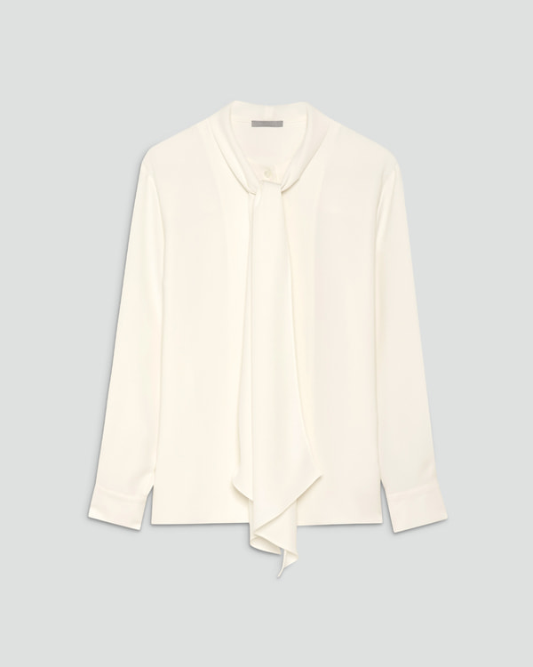 ミニマルなスタイリングで、ブラウスの襟元や袖のフェミニンなディテールを際立たせて。