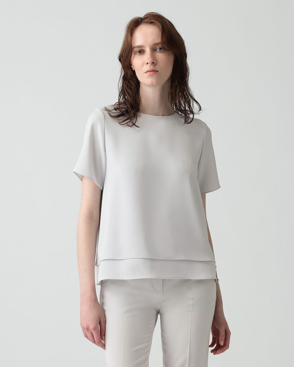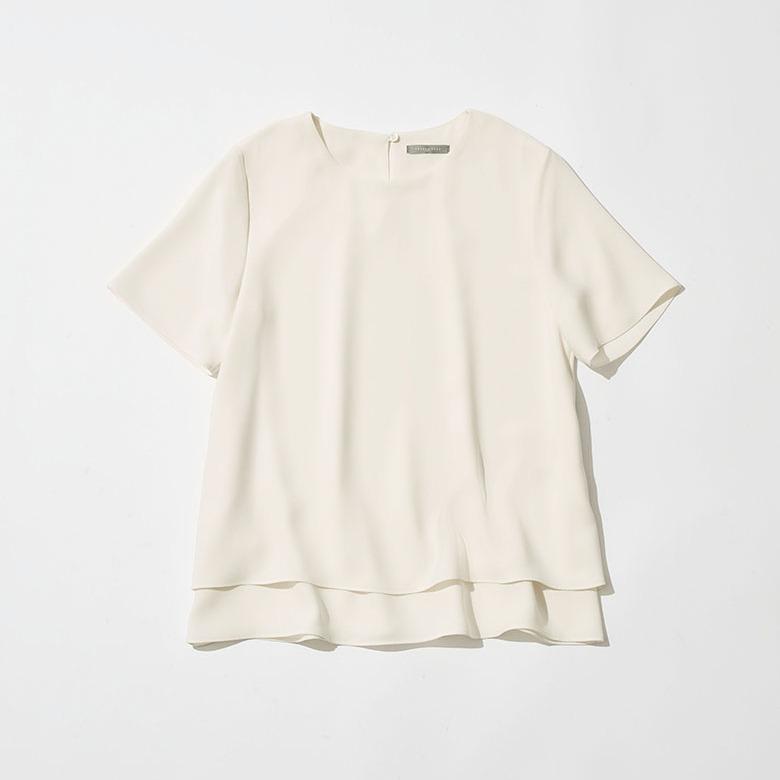 二枚仕立てになった身頃が目を引く、ウエストアウトスタイルにぴったりなブラウス。