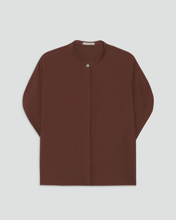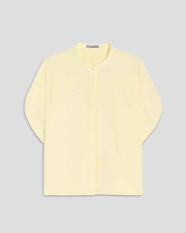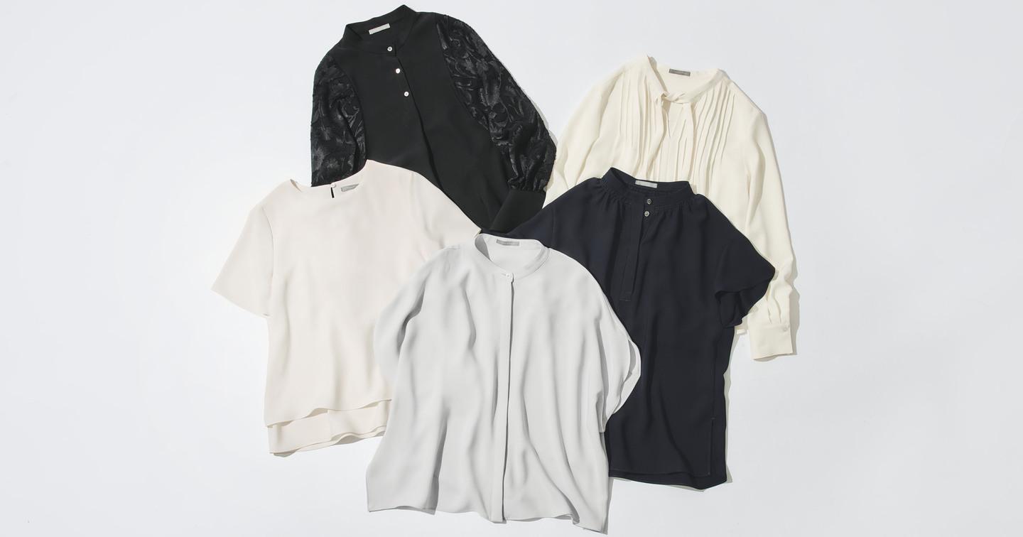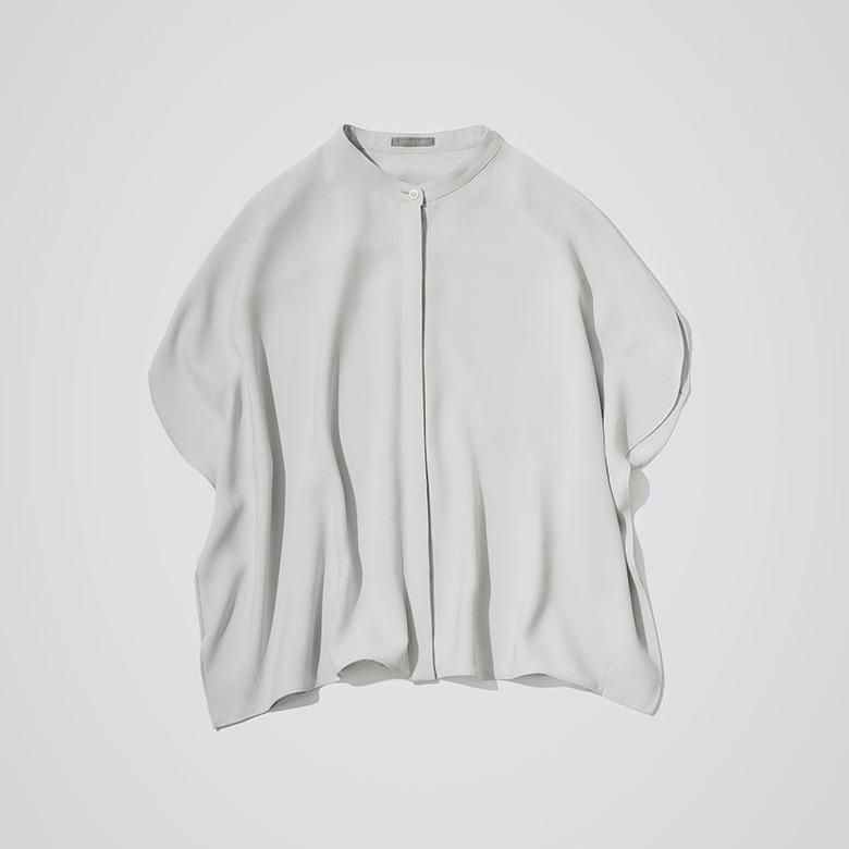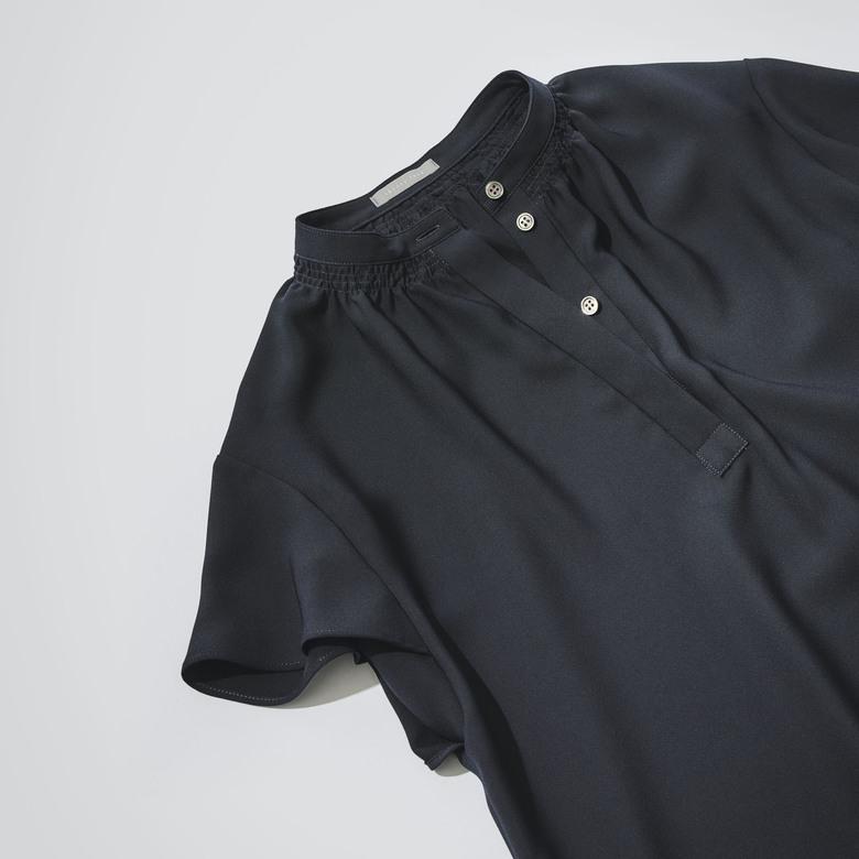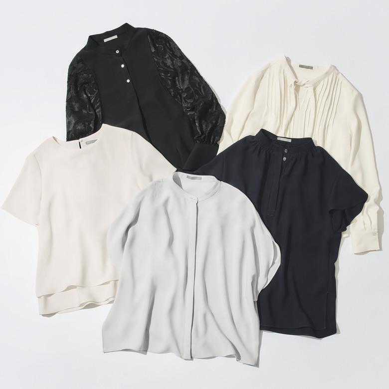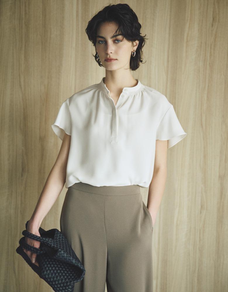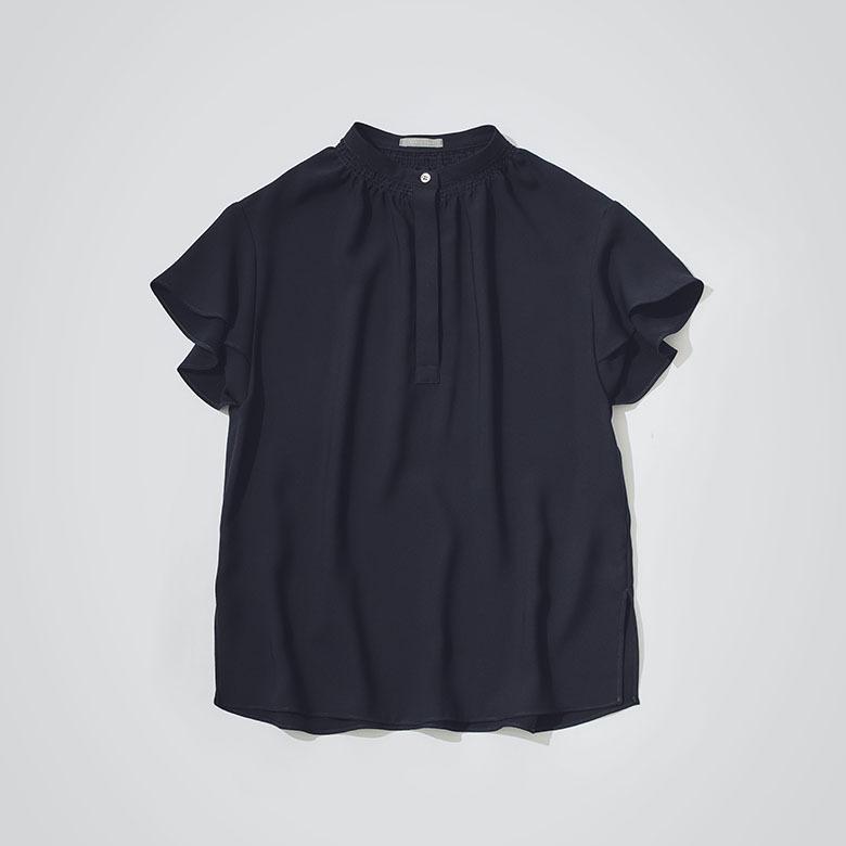 クリーンな比翼仕立てで 、ボタンの開閉で印象の変化が楽しめるプルオーバーブラウス。