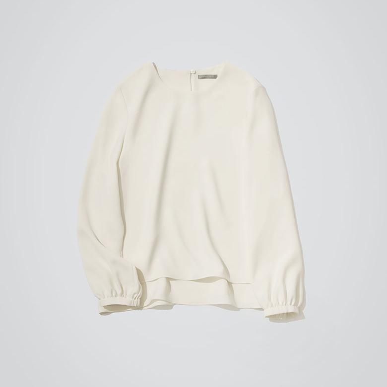 ブラウスの裾にあるデザインのおかげで、シンプルな中にもニュアンスが生まれて洗練度がアップ。