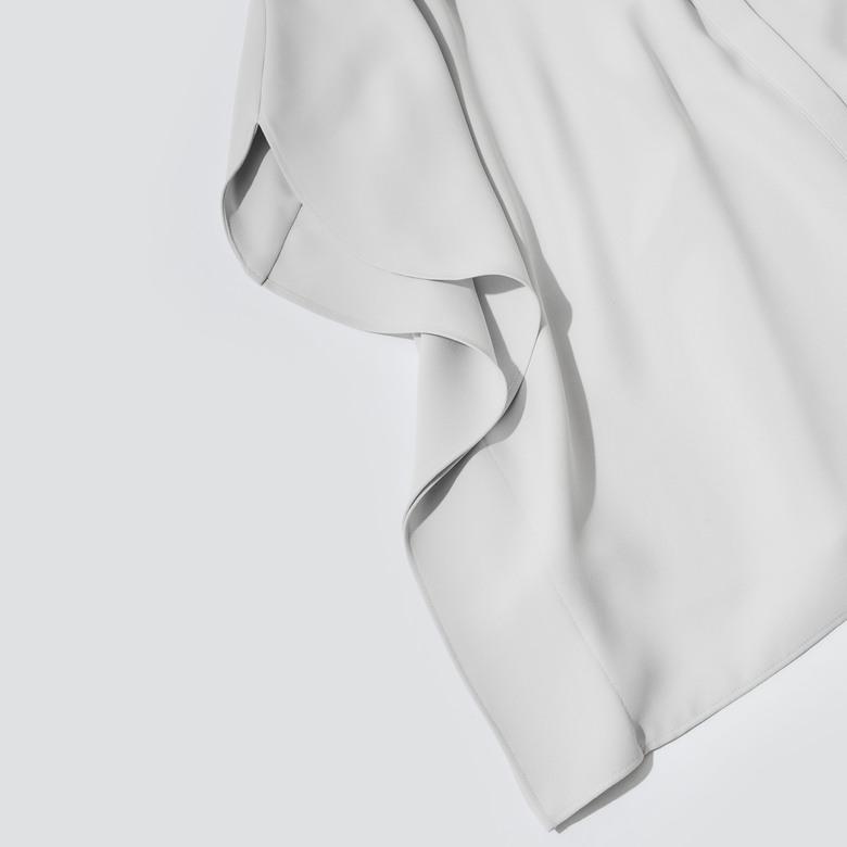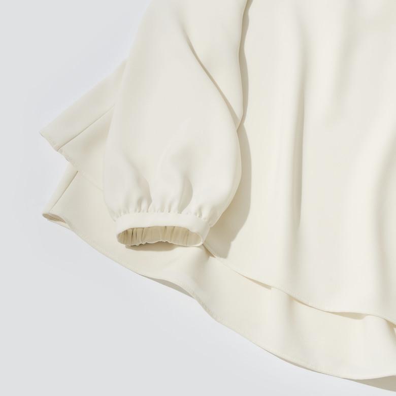 シャーリングのようなネック回りのディテールや、ドレープを活かした動きのあるスリーブデザインが華やか。