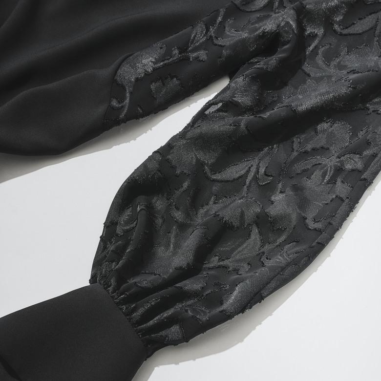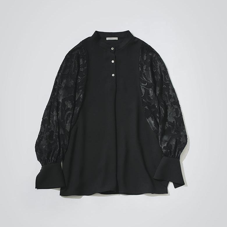 袖部分が程よい透け感のジャカード素材に切り替わった、軽やかなデザインブラウス。