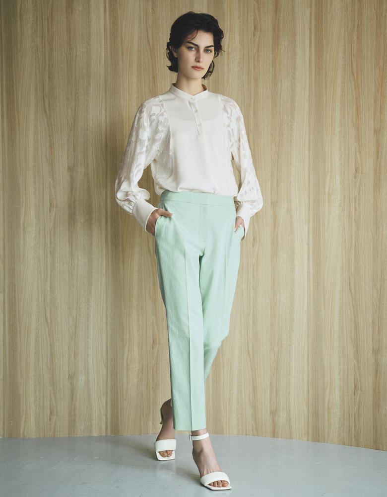 ブラウスの袖のボリューム感が引き立つよう、テーパードパンツですっきりまとめて華やかに。
