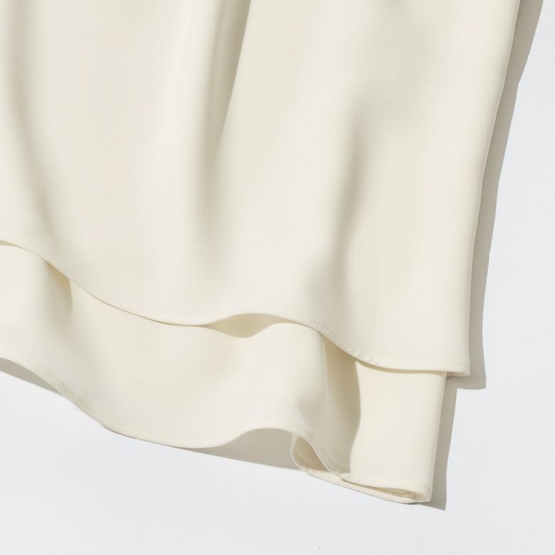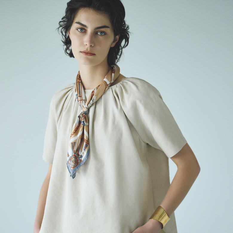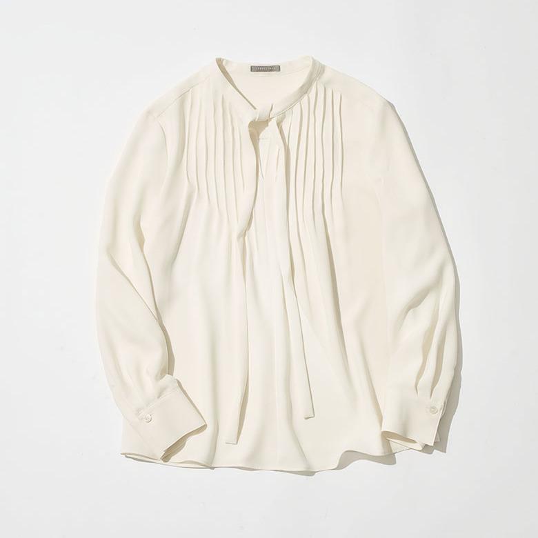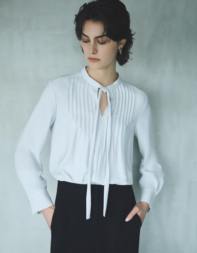 イレギュラーなピンタックが生み出す繊細なドレープが美しく、細めのタイはアレンジ自在。