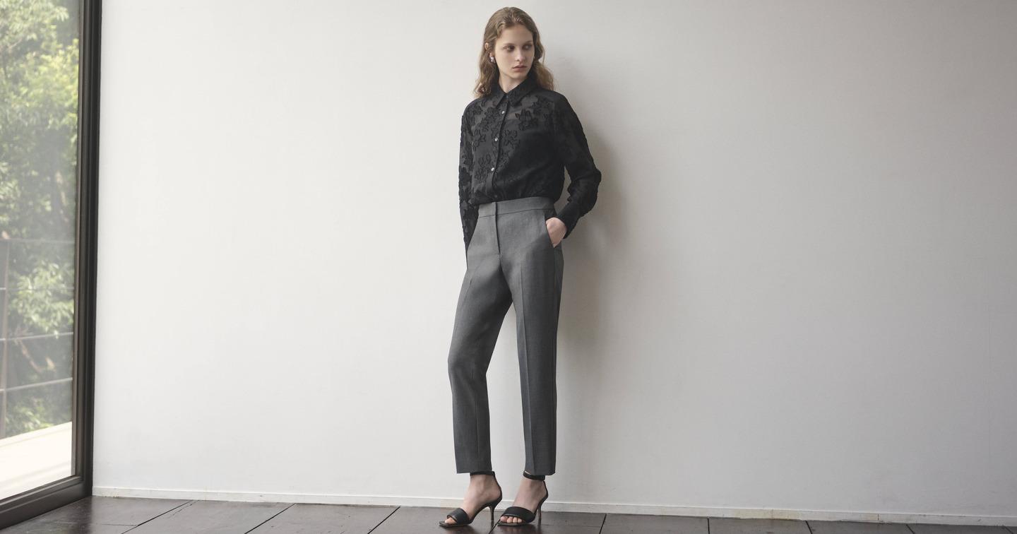 繊細かつ立体感のあるディテールが光るジャカード素材のブラウスを合わせ、ベーシックなパンツをブラッシュアップ。シックなモノトーンに、さりげなく女性らしさを添えて。