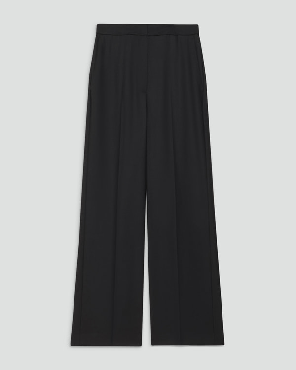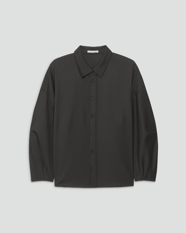 同素材のシャツとストレートパンツをセットアップ感覚で着こなし、ショートコートもブラックで統一。控えめながら洗練されたデザインのバッグがアクセントになり、ブラックコーデをこなれた印象に導く。